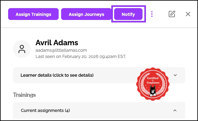The Notify button only appears for learners with assigned courses that are not yet completed. If all courses are complete or none are assigned, the button will be inactive.