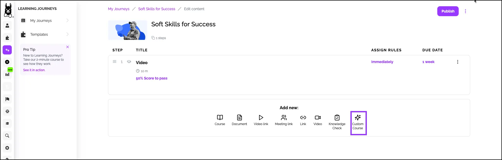 From within the desired learning journey, in the “Add New” module, click Custom Course.