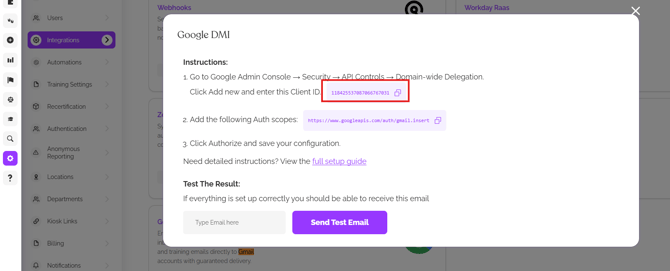 11. Go back to EasyLlama > Settings > Integrations > Google DMI. Enter an email address from the Google Workspace, click Send Test Email. Confirm that an email Google DMI Test Email is received to the entered email address.