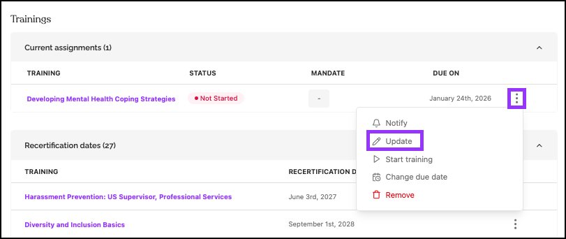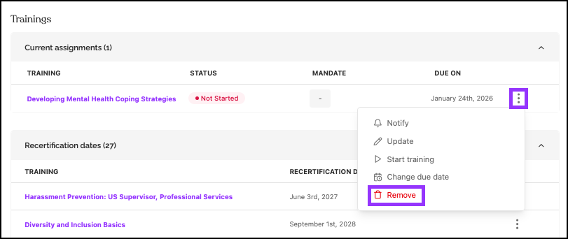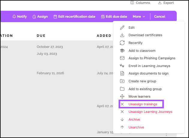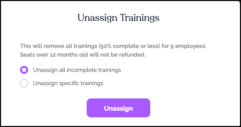 - Unassign all incomplete trainings to remove all trainings from the selected learners