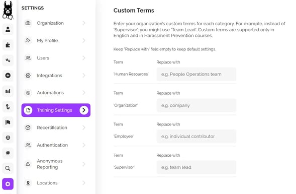 Keep your training language aligned to your culture. With Custom Terms, you can rename common role and org terms in Harassment Prevention courses. Swap “Supervisor,” “Employee,” “HR,” or “Organization” with labels your team actually uses.
