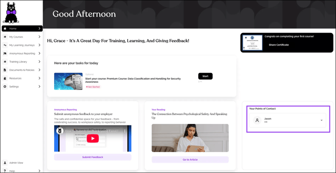Internal Points of Contact let Learners know exactly who to contact with questions. These contacts appear in the Learner Portal and courses, so it’s important to ensure their contact information is up to date.