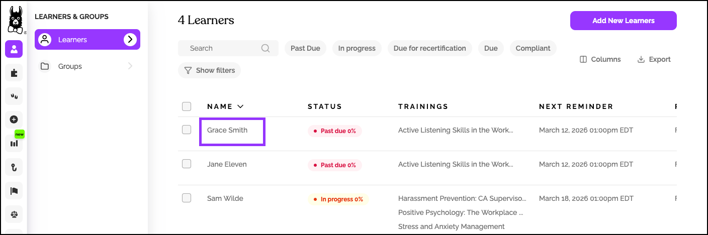 - Click directly on the learner's name (not the checkbox) to open their profile