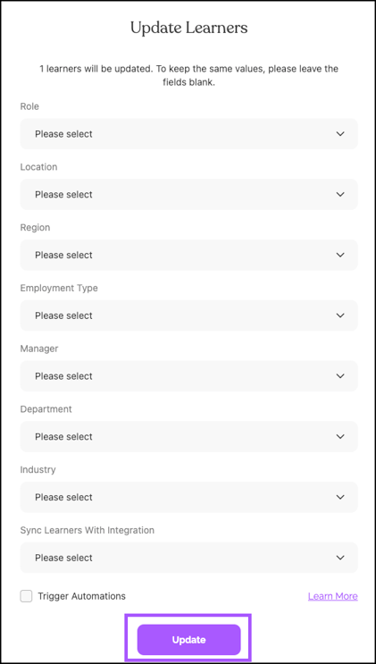 Click Update to save your changes. The updates apply immediately to all selected learners.