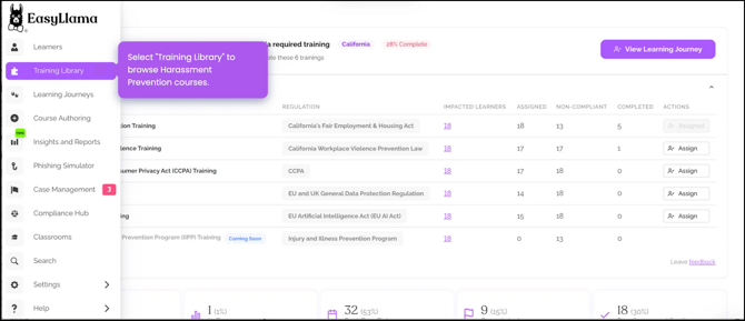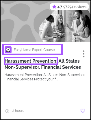 Only official Harassment Prevention courses (identified as "EasyLlama Expert Course" with "Harassment Prevention" in the title) from the Training Library.
