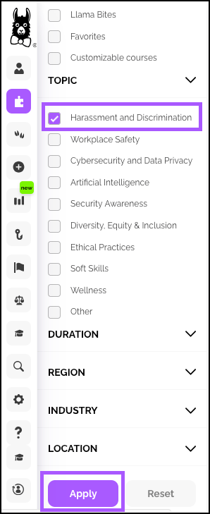 - Apply the Harassment and Discrimination filter and click Apply.
