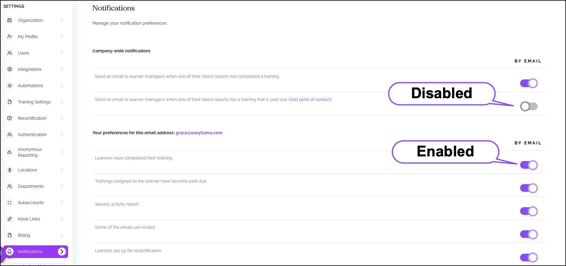 For each notification type, use the toggle switch to turn ON (purple) or OFF (gray):