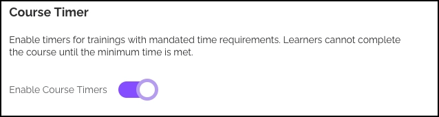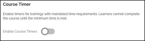 - Toggle OFF (gray): Time enforcement is disabled. Learners can complete courses at their own pace, regardless of mandated minimum duration.