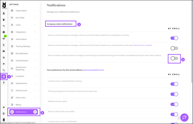 Go to Settings > Notifications. Under Company-wide notifications, enable or disable the toggle for Send a weekly email to managers summarizing overdue and completed training.