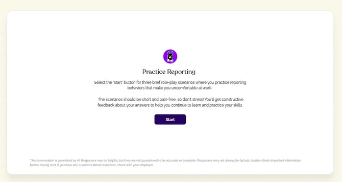 - View the scenario: Learner sees a chat interface with an introduction and first prompt