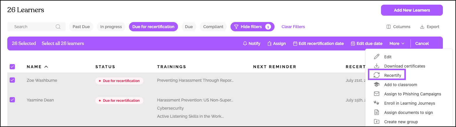 Select learners to recertify: