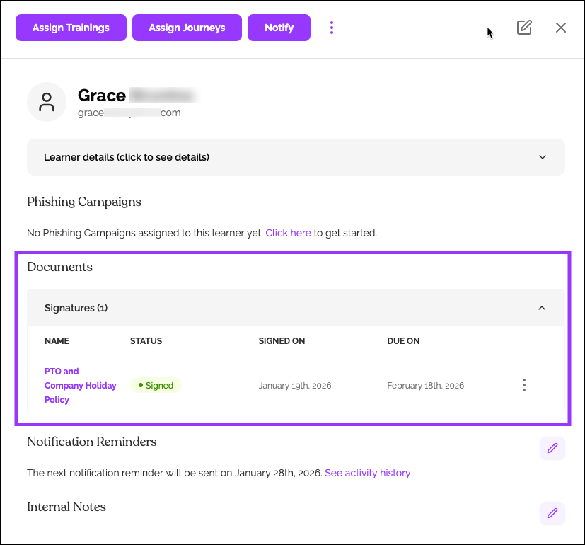 - View all documents assigned to this learner and their signature status
