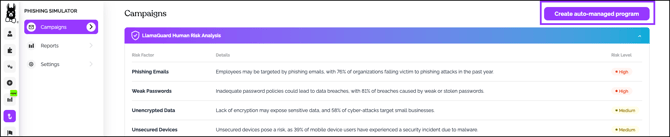Set up a continuous phishing awareness program in minutes. The Auto‑Managed Program automatically schedules and rotates campaigns, assigns learners, and tracks results so you can improve human risk with less manual work.