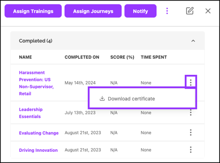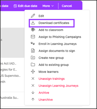 Download completion certificates for learners using either bulk download (for multiple certificates via email link) or single download (for immediate access from a learner's profile).