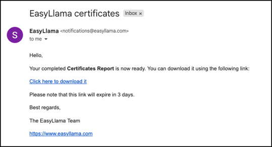 Use this method when you need certificates for multiple learners. An email with a download link is sent to the requestor.