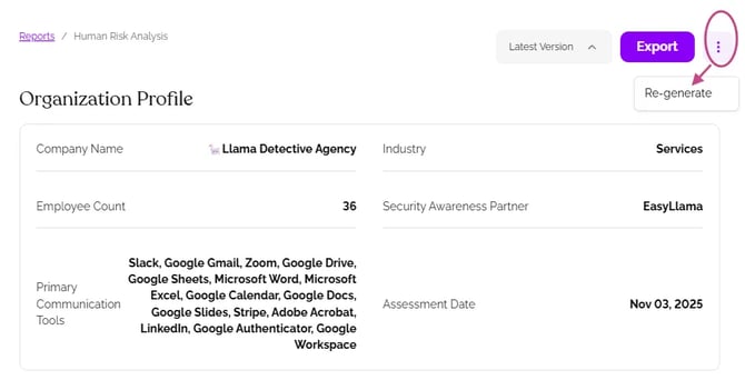 - Click the ellipsis menu (⋮) > Re-generate to run the analysis after making changes to tooling, processes, or training cadence to measure improvement under the Settings tab